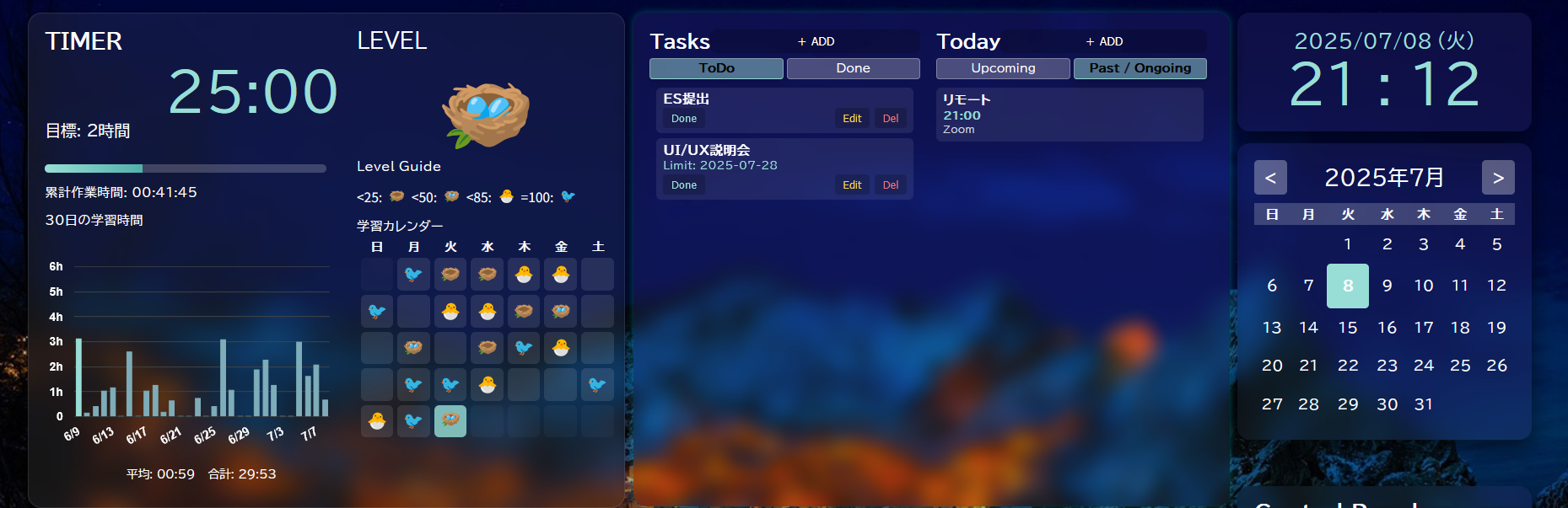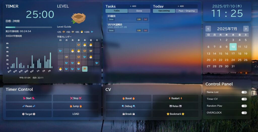継続すると鳥が成長、ガラス風UIを採用と遊び心を意識して制作しました。